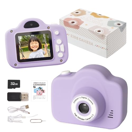 アンジュスマイルの多機能キッズカメラは、2000万画素の写真と1080p動画撮影が可能です。ゲーム付きで、パープルカラー、32GBのSDカードが付属します。子ども向けの楽しいトイカメラです。