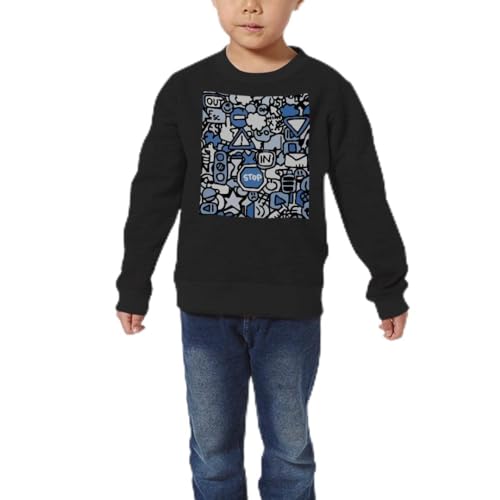 キッズ用黒トレーナー、130サイズ。長袖、裏パイルで快適。ボーイズ・ガールズ向けクルーネックデザイン。道路標識のプリント入り。
