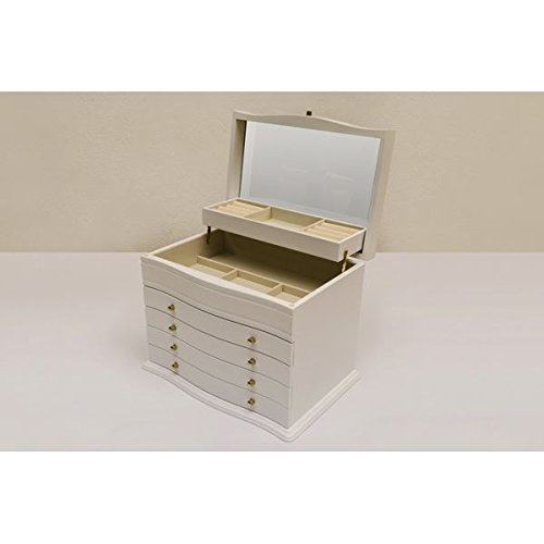ジュエリーボックスは幅34cmの木製で、ホワイトカラー。内側はフエルト張りで、ミラー付き。小物やメイクの収納に便利ですが、代引不可です。