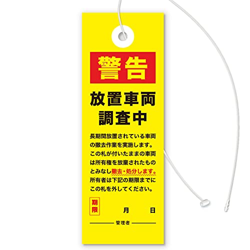 放置自転車撤去警告下げ札(調査中Ver)は、迷惑駐輪や無断駐輪対策に最適な撥水タイプです。屋外での使用にも対応し、雨天でも効果を発揮します。30枚入りで便利。
