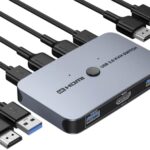 ABLEWEのKVMスイッチは、2入力1出力のPC切替器で、4K解像度に対応。マウスやキーボード、プリンターを共有可能。電源付きで、USBケーブル2本とHDMIケーブル2本が同梱されています。