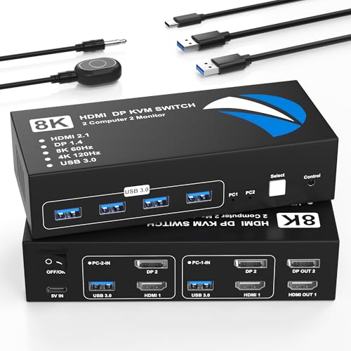 8K@60Hz対応のHDMI+DisplayPort KVMスイッチ。2台のPCと2台のモニターを切り替え可能。5Gbpsの高速USB 3.0ポート4つ搭載、キーボードやマウスに対応。付属品にはUSB3.0ケーブル、手元スイッチ、電源ケーブル、日本語説明書あり。