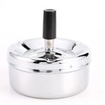 ステンレス製の丸い押し下げ式灰皿は、高級感あふれるデザインで耐久性も抜群。回転トレイ付きで使いやすく、タバコの灰を簡単に処理できます。