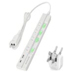 電源タップ USB延長コード1m。AC 4口、USB-A 1口、Type-C 1口で急速充電対応。スイッチ付き、雷ガード、サージ保護機能を搭載。旅行にも最適。おしゃれなホワイトとブラックのデザイン。