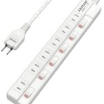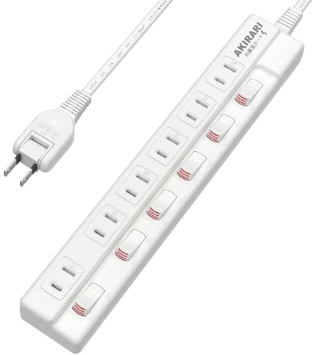 電源タップは3mの延長コードで、6個のAC口と個別スイッチ付きです。雷ガード、ほこりシャッター、コンパクト設計、省スペースで1500Wまで対応。スイングプラグで隙間配線も可能です。