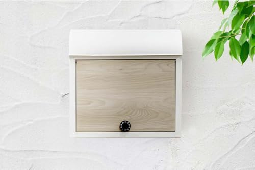 おしゃれな木目調の壁掛け郵便ポスト。スチール製でA4サイズ対応。ダイヤルロック付きで安全に収納。新聞や雑誌も収納可能。ホワイト×アッシュ木目調でエクステリアに映えるデザイン。