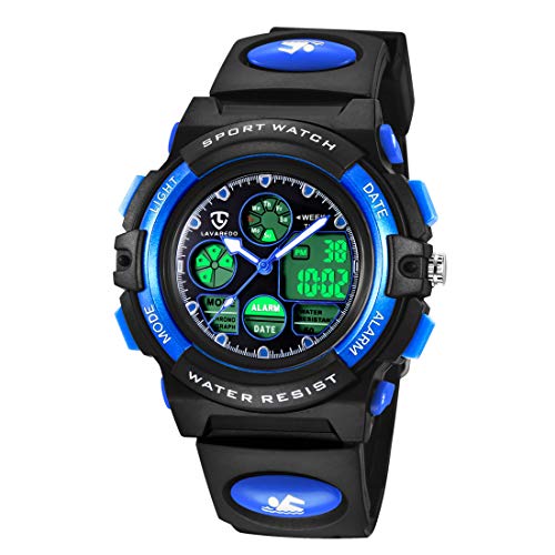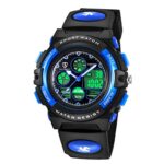 子供腕時計、ボーイズスポーツウォッチ。アウトドア向け、多機能防水。アラート、日付・曜日表示、デュアルタイム機能付き。LEDアナログ表示で、男女共に使える蛍光ブルーのデジタルウォッチです。