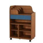 白井産業のランドセルラックは、キャスター付きで文具や学用品を収納できます。サイズは幅62.7cm、高さ93.3cm、奥行39.3cm。ダークブラウンとブルーのやさしいデザインがリビングに馴染みます。