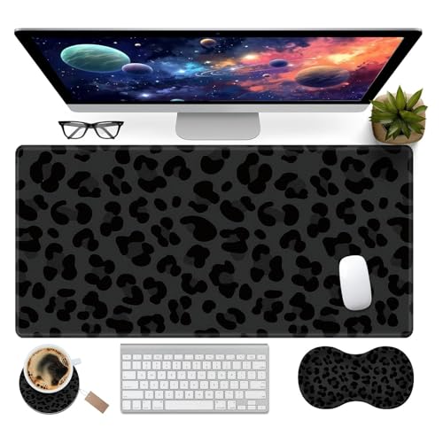 大型マウスパッドと人間工学に基づいた手首サポートパッド、コースター付きのデスクマット。滑り止めベースとステッチエッジで耐久性も◎。ブラックヒョウ柄デザイン。