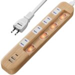 SAYBOUR 電源タップは4口コンセント、USB-Aポート2つ、Type-Cポート1つを搭載。1.5mのケーブル、ほこり防止シャッター、雷ガード付き。木目調デザイン。
