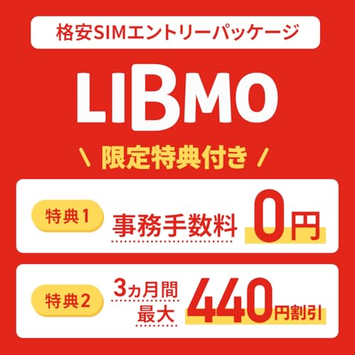 LIBMOエントリーパッケージは、事務手数料3,300円が無料で、さらに3ヵ月間440円割引の特典付き。ドコモ回線の格安SIMカードで、データ通信と音声通話に対応。iPhoneやAndroidにも使用可能です。
