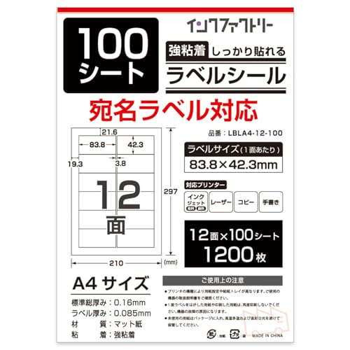 インクファクトリーのA4サイズラベルシールは、100枚入りで12面形式。強粘着のマット紙製で、各社のプリンタに対応。サイズは83.8×42.3mm、中厚口で1200片の発送用シールとして最適です。