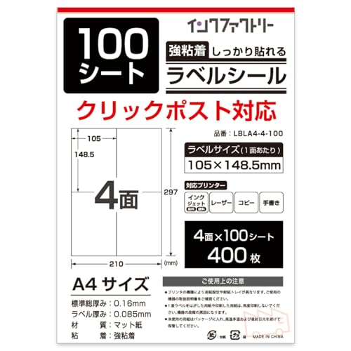 A4サイズのラベルシール。四角型で4面、100シート(400片)入り。サイズは105×148.5mm。インクジェット・レーザープリンタに対応し、強粘着のマット紙製。クリックポストにも対応。