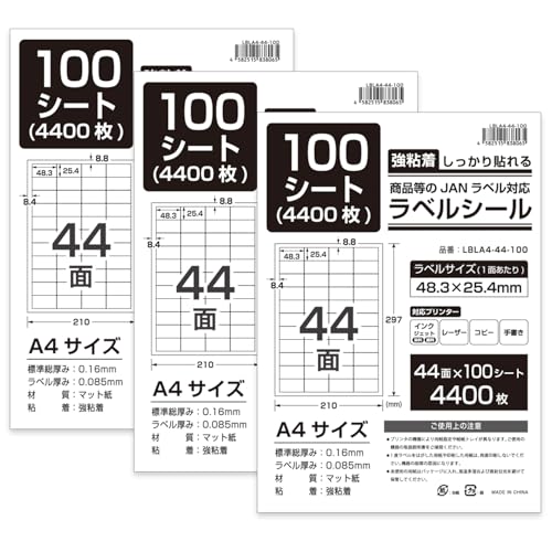 エコスロ ラベルシール A4 44面(サイズ: 48.3×25.4mm)。300シートで合計13200面。強粘着マット紙を使用し、インクジェット/レーザープリンター両方に対応。