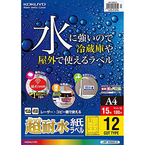 コクヨのラベルシールLBP-WS6912は、カラーレーザーおよびカラーコピーに対応した超耐水ラベルです。15枚入りで12面仕様。耐久性があり、屋外利用にも適しています。