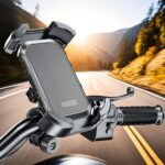この自転車用携帯電話ホルダーは、4.7インチから6.8インチのスマートフォンに対応。オートバイにも取り付け可能で、安定した保持力を提供します。