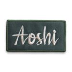 刺繍ザウルスのレザー調ロゴ風セミオーダーお名前ワッペン。ベルクロ(面ファスナー)加工済み。フック側は黒で、最大8文字まで対応。個性的なスタイルを演出し、容易に取り付け可能。