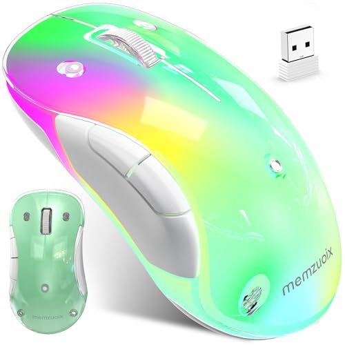 memzuoix 2.4G無線マウスは、RGB LED、着脱式カバー、充電式で人体工学設計。1200DPI光学式、5ボタン搭載、ポータブルでUSBレシーバー付属。PC、ノートPC、デスクトップ、MacBookに対応。ミントグリーン。
