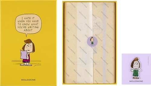モレスキンのピーナッツペパーミント・パティノートはハードカバーのラージサイズ。横13cm、縦21cmのサイズで、横罫のページが特徴。黄色いデザインが目を引くノートボックス付き。