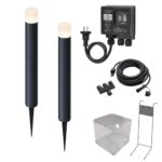 タカショーのガーデンライト間のひかりLGL-LH04Pは、雨よけ付きコントローラーと基本セット2本、スタンドが含まれています。シンプルなデザインで、庭の演出に最適です。