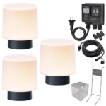 タカショーの「ガーデンライト 語らいのひかり LGL-LH06P」は、コントローラー雨よけ付の基本セットで、ライトが計3本、スタンド、コントローラーが含まれています。