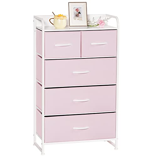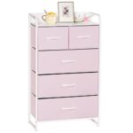 LYNCOHOMEのピンク収納チェストは、布製で可愛いデザイン。引き出しが4段5杯あり、一人暮らしやリビング収納に最適。転倒防止機能付きで、低ホルムアルデヒド仕様。サイズは幅58×奥行29×高さ99.5cm。