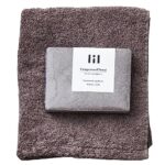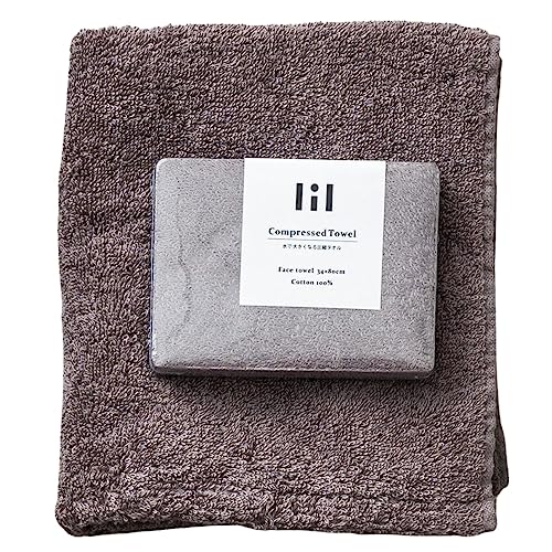 「lil(リル)水で大きくなる圧縮タオル」は、フェイスタオルで約34×80cm。圧縮時は約2×8×11cmの軽量で、綿100%のふわふわな肌触り。高吸水性で、結婚祝い・誕生日・プチギフトに最適なグレーのデザインです。