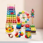 LIVIAの木のおもちゃセットは、1〜3歳向けの知育玩具で、木琴、積み木、ベル、時計、マラカスなど9点が含まれています。形状認識や音楽を通じて楽しく学べるアイテムです。