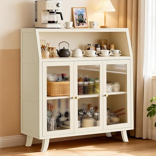 多機能竹製食器棚。アクリル扉で防塵、調味料やティーセット収納に最適。オープン多層設計で省スペース。おしゃれな北欧風。簡単組立で安定性も抜群。サイズ: 98×32×95cm。