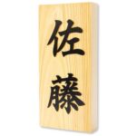 木製のヒノキ表札です。縦型で、15cm(5寸)と18cm(6寸)サイズがあり、浮き彫りデザインでおしゃれ。マンションや戸建て、会社に最適。貼るだけの簡単取り付けで、和風スタイルを演出。新築祝いにもぴったり。