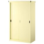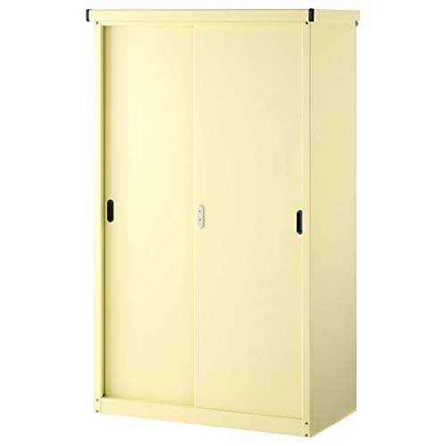 ぼん家具の大型屋外物置は、幅92.7×奥行50.4×高さ155cmで、鍵付きのスチール製です。縦仕切り付きで総耐荷重80kg。家庭用収納庫に最適なクリームイエローのデザインです。