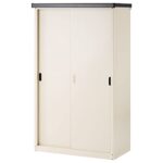 ぼん家具の屋外用大型物置。サイズは幅92.7×奥50.4×高155cm、スチール製で撥水効果あり。鍵付きで安心の収納庫。縦タイプで省スペース、軍手も付属。カラーはアイボリー。