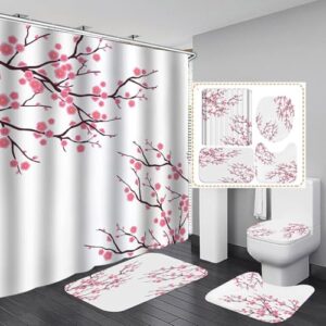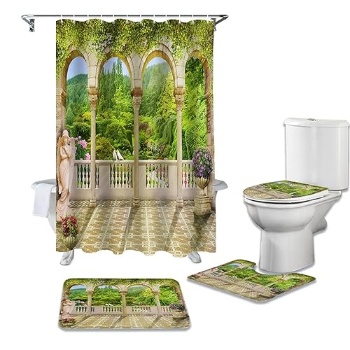 LHGBGBLNの4ピースシャワーカーテンセットは、レトロな中庭の風景と緑の山が描かれた防水仕様。バスルームカーペット、便座クッション、フロアマットも含まれ、トータルコーディネートが可能です。