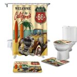 LHGBGBLNの4ピースシャワーカーテンセットは、レトロカーやシーサイドビーチのデザインが魅力的。防水機能付きで、バスルームにぴったりのカーペットや便座クッション、フロアマットも含まれています。