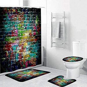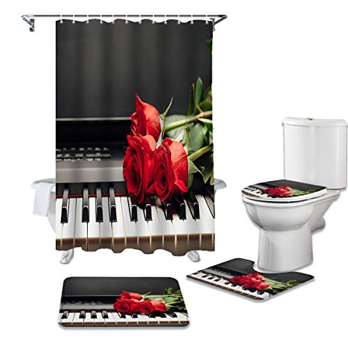 LHGBGBLNのシャワーカーテン4点セット。ピアノ音楽と赤いバラの花のデザイン、耐水性。バスルームカーペット、便座クッション、フロアマット付き。