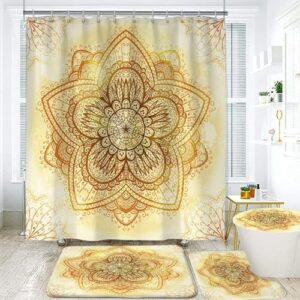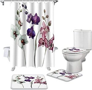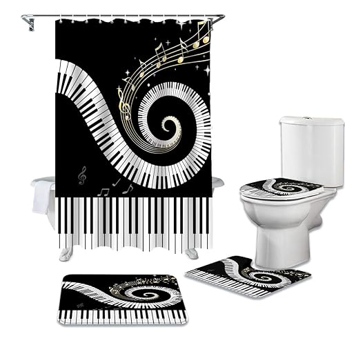 LHGBGBLN 4ピースシャワーカーテンセットは、黒と白のピアノキー渦巻きデザインが特徴。防水仕様で、バスルームカーペットと便座クッションも含まれています。