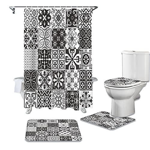 LHGBGBLN シャワーカーテン4点セットは、華やかなフラワースクエアアートとアラベスクデザイン。防水機能付きで、バスルームのカーペット、便座クッション、フロアマットが含まれています。