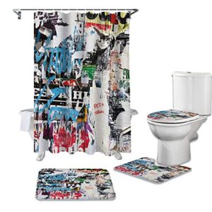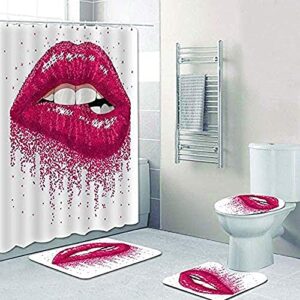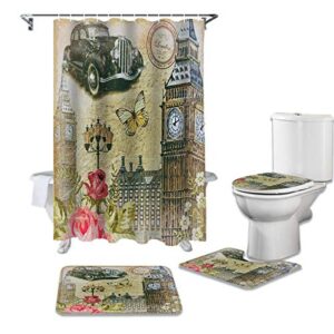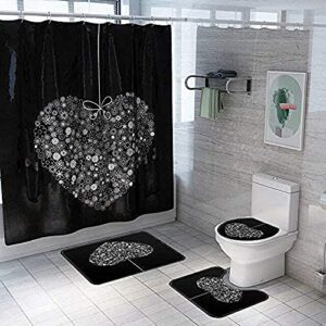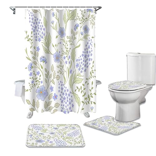 LHGBGBLNのシャワーカーテン4点セットは、フラワースタメングリーンブルーリーフデザインの防水カーテンとバスルーム用カーペット、便座クッション、フロアマットが含まれています。