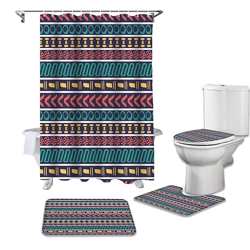 LHGBGBLNのシャワーカーテン4点セットは、ストライプエスニックスタイルで防水機能を備えています。バスルームカーペットと便座クッション、フロアマットが含まれ、快適でスタイリッシュなバスルームを演出します。