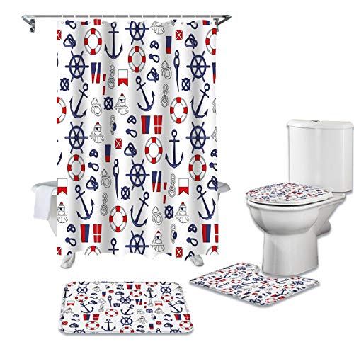 LHGBGBLNの4ピースシャワーカーテンセットは航海テーマのデザインで、防水性を備えています。バスルーム用カーペットと便座クッション付きで、統一感あるスタイルが楽しめます。