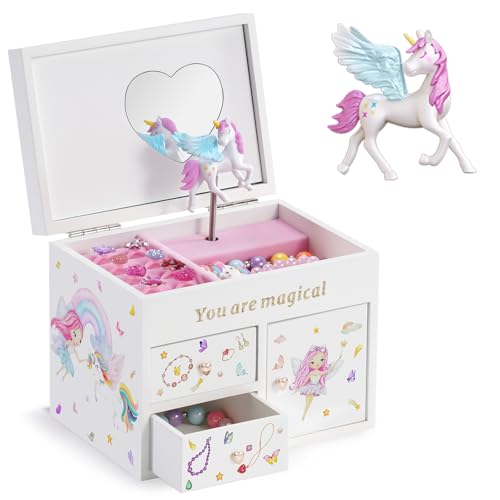 Lolaletのキッズアクセサリケースは、可愛いユニコーン付きの2段式木製オルゴールボックスです。七五三、誕生日、クリスマスのプレゼントに最適なホワイトカラー。