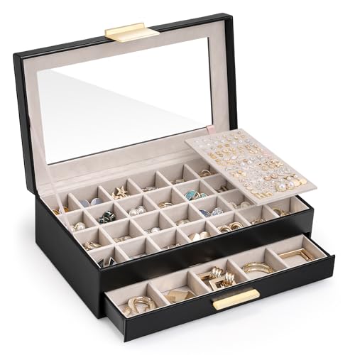 Lolalet ピアスケース 2段式 イヤリング収納 大容量 引出し付き 透明ガラス蓋 女性 ディスプレイ 見せる収納 -ブラックの高価買取