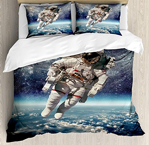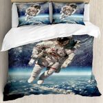 Funy Decor Galaxy寝具セットは、宇宙飛行士が地球を浮遊する幻想的なデザインの4ピース布団カバーセットです。グレーブルーの色合いが魅力的で、子供から大人まで幅広く使えます。