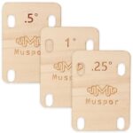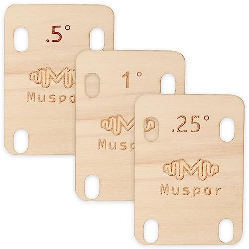 3ピースのギターネックシムで、ソリッドメープルウッド製。0.25、0.5、1度の調整が可能で、ギターネックプレートの補修に最適です。ギターやベースのネック修復に役立ちます。