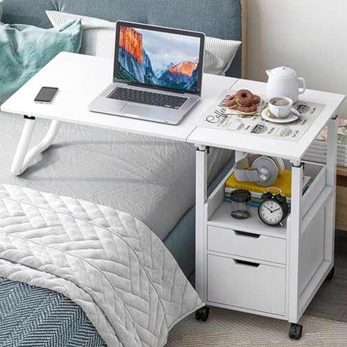 2 in 1の折りたたみ式オーバーベッドテーブル。キャスター付きで移動容易、高さ調節可能。ノートパソコンや家庭用に最適なホワイトカラーのテーブル。