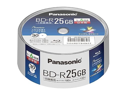 パナソニックの6倍速BRディスクは、片面1層25GBの容量を持ち、追記が可能なタイプです。スピンドルには30枚入りで、データ保存やバックアップに最適です。高品質な映像保存が実現できます。