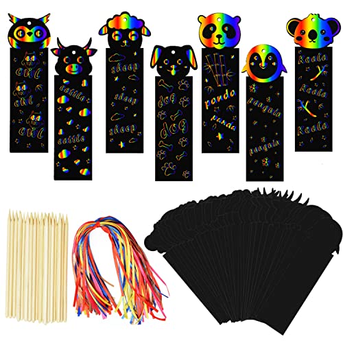 WEFOO アニマルスクラッチブックマークは70個入りで、子供向けパーティー記念品に最適。レインボーアートペーパー製でDIYクラフトに使え、誕生日や教室の景品にもおすすめです。木製スタイラス付きでカラフルなリボンが特徴。