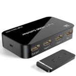 HDMI切替器は3入力1出力に対応し、HDMI2.1で8K@60Hz、4K@120Hz、1080P@240Hz出力を提供。48Gbpsの帯域幅、HDR、3Dに対応し、PC、PS4/PS5、Xboxなど様々なデバイスに接続可能。IRリモコン付属。