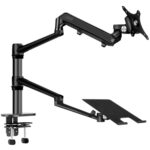LOE デュアルモニターアームはノートパソコンや液タブに対応し、2画面を縦に上下配置可能です。組み立て簡単なロングタイプで、スタイリッシュなブラックデザイン。