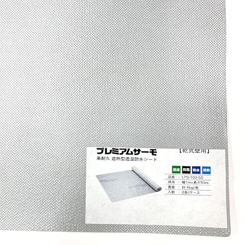 外壁用遮熱透湿防水シート「ラミテクト プレミアムサーモ」は、1x50mサイズで2巻入。乾式壁用の住宅防水シート。高い遮熱性と透湿性を兼ね備え、セーレンのアミと同等の性能を持つ製品です。